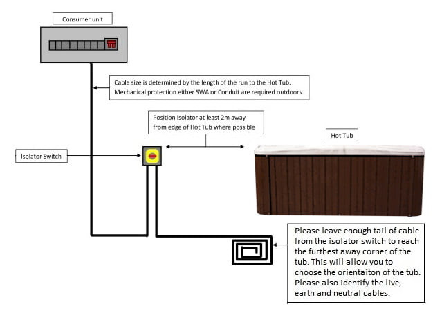 From the isolator switch, there needs to be enough cable left to reach the furthest away corner of the spa so that our engineer can connect it to the hot tub or swim spa.